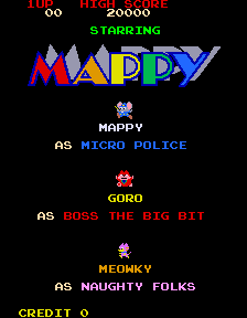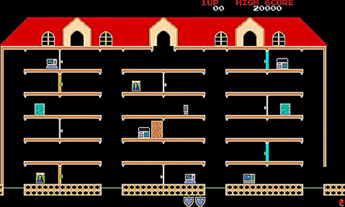 Mappy lets you play as Mappy whom must recover the items that were stolen from Goro and the Meowkies. The setting of the game is Goro’s mansion, and in each level the player must traverse its many floors via trampolines. The input controls are a joystick to move and a button to open/close the doors on each floor.